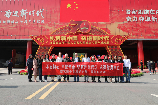 “礼赞新中国 奋进新时代。”为期一个月的江苏省庆祝中华人民共和国成立70周年成就展不久前刚刚落下了帷幕,展期内,60余万名观众来到现场参观。10月23日下午,南艺附中的部分党员教师及团员学生也成为了亲历者之一。在附中直属党支部书记管斌的带领下,附中领导班子成员及党员、团员师生不仅亲身感受了中国及江苏70年来发展的辉煌成就,更是在现场迎来了一次特殊的党课与团课,经历了视觉的风暴和思想的洗礼。